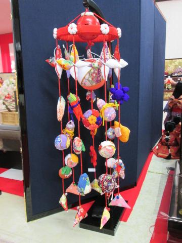 花、人形、野菜などのちりめん小物を縦につるした飾りです。