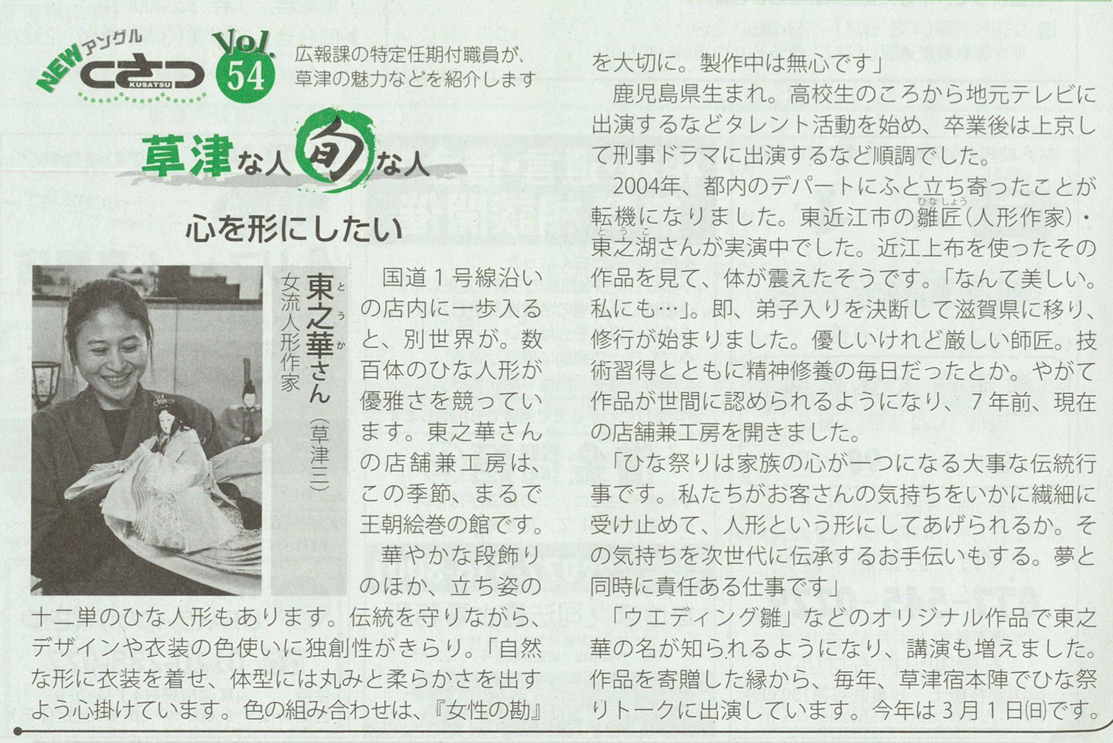 そして2004年から滋賀県東近江市五個荘の地で人形師・東之湖に師事し、人形づくりの 道を本格的に歩み始めた。